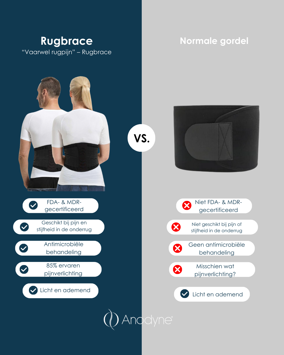 De rugbrace is ontwikkeld om gerichte ondersteuning en stabiliteit in de onderrug te bieden, waardoor pijn en spanning in het dagelijks leven worden verminderd. In tegenstelling tot een gewone riem, die slechts beperkte ondersteuning biedt, is de rugbrace ontworpen met focus op comfort, stabilisatie en effectieve verlichting van rugpijn. De rugbrace is FDA- en MDR-geregistreerd, antimicrobieel behandeld en zorgt voor gelijkmatige compressie die de onderrug zowel tijdens activiteit als in rust stabiliseert. Veel gebruikers rapporteren een pijnvermindering tot wel 85%, terwijl het materiaal licht en ademend blijft en zo de hele dag comfortabel te dragen is.